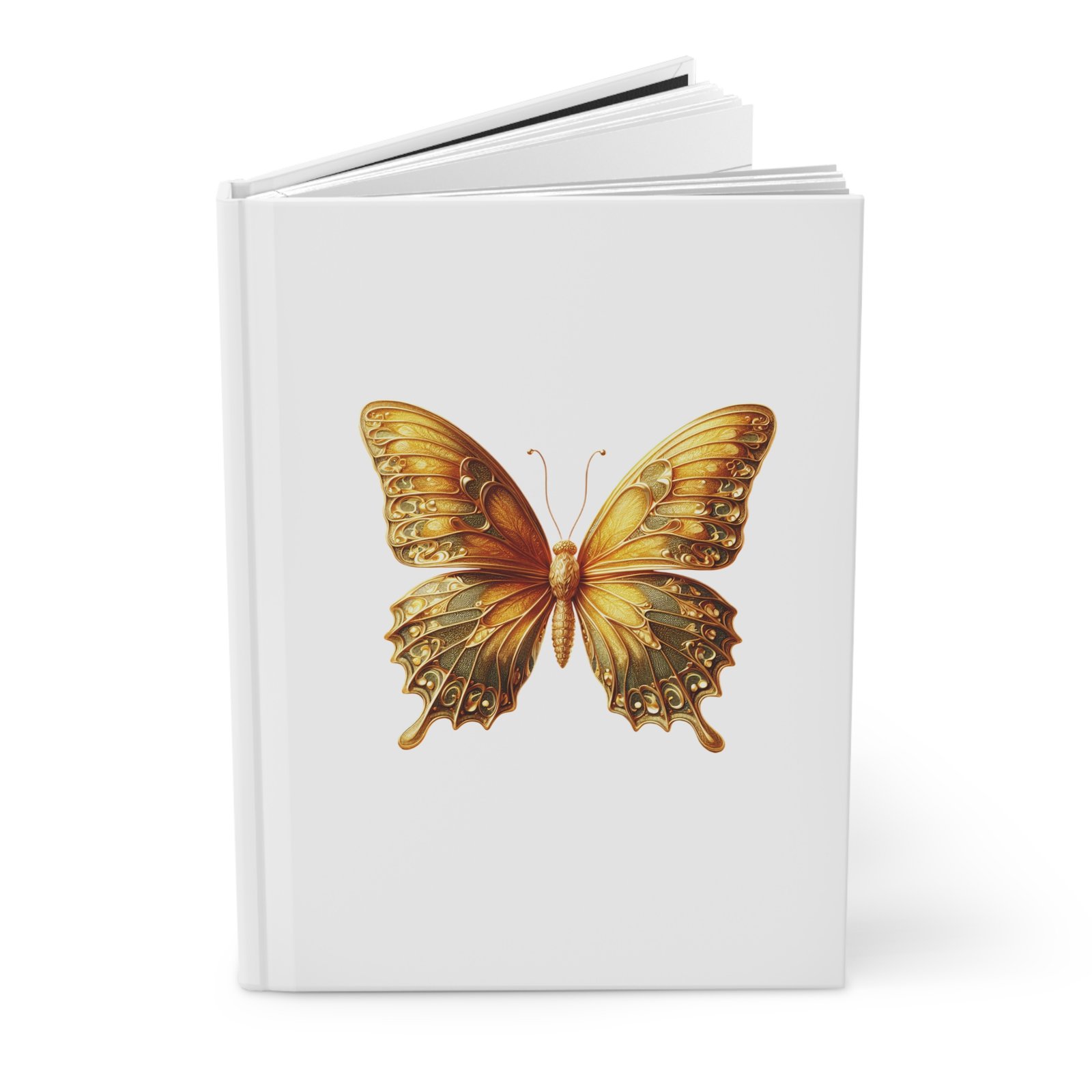A soft, matte-covered hardcover journal decorated with warm golden butterflies drifting across a cool, marbled grey background. Its full-wrap print and silky matte laminate give the cover a refined, tactile feel while the sewn casewrap binding keeps the spine flexible so the book opens flat and writes smoothly. Inside are 150 lined pages with convenient perforations for tearing out notes or sketches. Small details like vivid printing and a subtle production barcode on the back show high-quality, ready-to-use craftsmanship — an elegant everyday journal for captured thoughts, lists, and quiet moments.